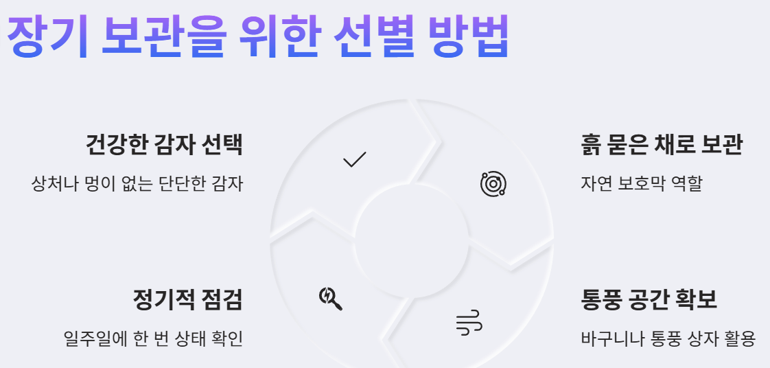 - 건강한 감자 고르기: 보관을 시작하기 전에 겉면에 상처나 멍이 없고 단단한 감자를 선택하는 것이 중요합니다. 이미 손상된 부분은 부패가 시작될 가능성이 높으며, 이는 주변의 다른 감자에게까지 영향을 미칠 수 있습니다. 꼼꼼하게 살펴보고 최상의 상태인 감자만을 보관하도록 합니다.