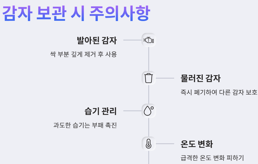 - 정기적인 점검과 선별 제거: 보관 중인 감자를 일주일에 한 번 정도는 꼼꼼하게 확인하여 싹이 나거나 물러지기 시작한 감자는 즉시 제거해야 합니다. 싹이 난 부분은 깊게 도려내고 나머지 부분을 섭취할 수 있지만, 이미 물러진 감자는 주변의 건강한 감자까지 부패시킬 수 있으므로 즉시 버리는 것이 좋습니다.